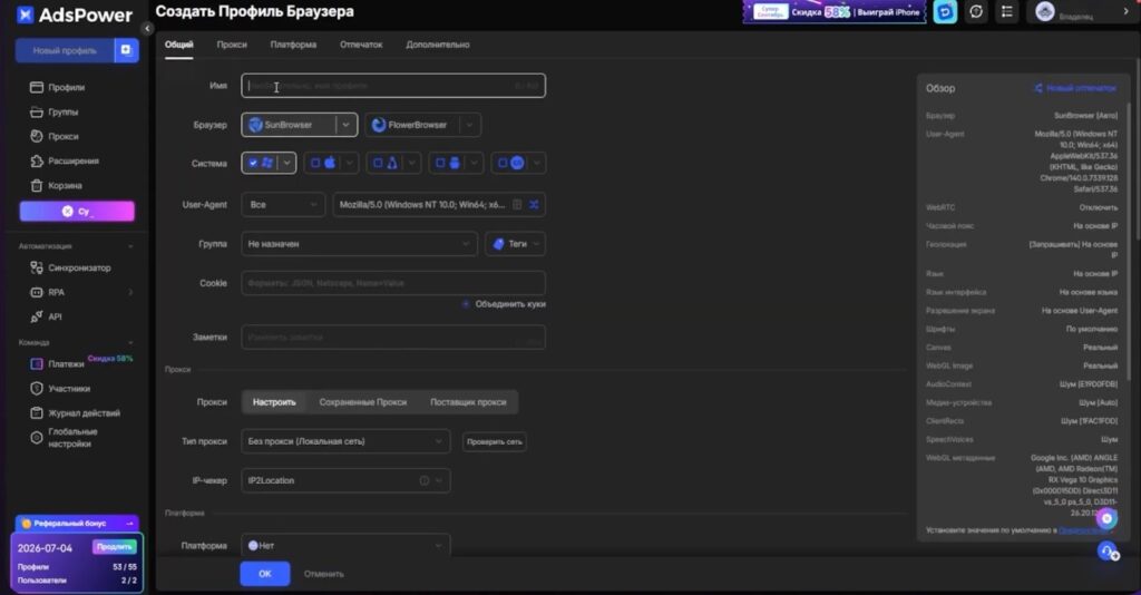 Для обмана антифрод-систем и работы в интернете без преград идеально подходит антидетект-браузер AdsPower. Браузер создает уникальные цифровые отпечатки, неотличимые от живых пользователей, и позволяет управлять несколькими аккаунтами в одном месте. AdsPower обманывает даже мощнейшие антифрод-системы популярных платформ, таких как TikTok и Google Ads. Для каждого профиля можно добавлять отдельный прокси, чтобы IP адреса не повторялись, и спокойно заниматься мультиаккаунтингом без риска бана.